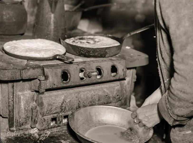 October 1935. "Making cornbread with relief flour. Shenandoah National Park, Virginia." Medium format negative by Arthur Rothstein.